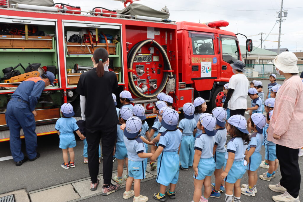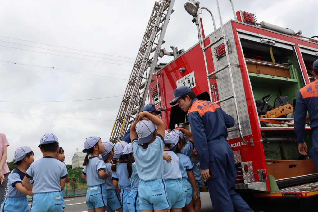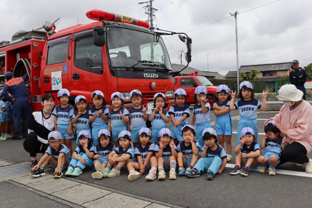 年長児の幼年消防クラブ編成式後に、他のクラスの子どもたちも